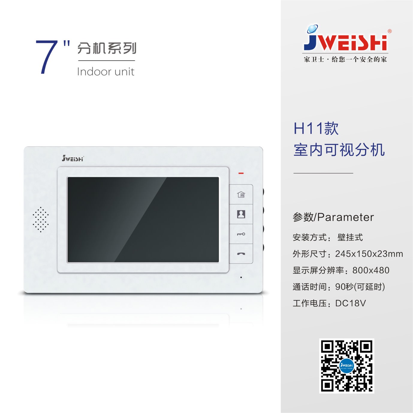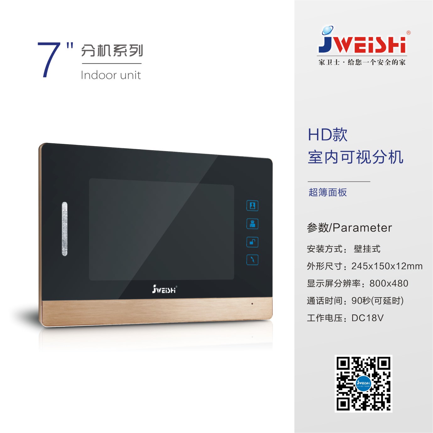 显示屏:7寸TFT显示屏分辨率:800*480安装方式:壁挂式 外形尺寸:245*150*10(mm)振铃时间:30秒通话时间:90秒(可延时)