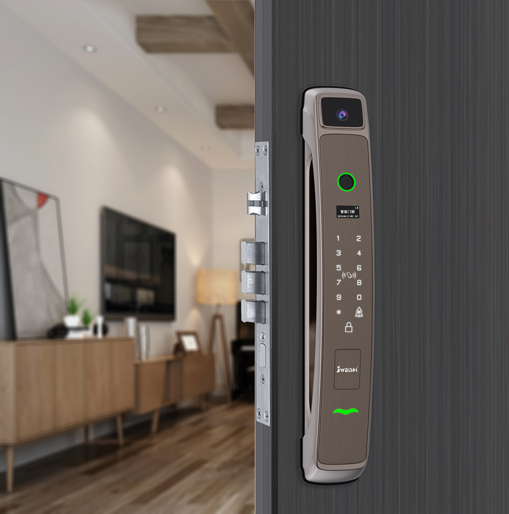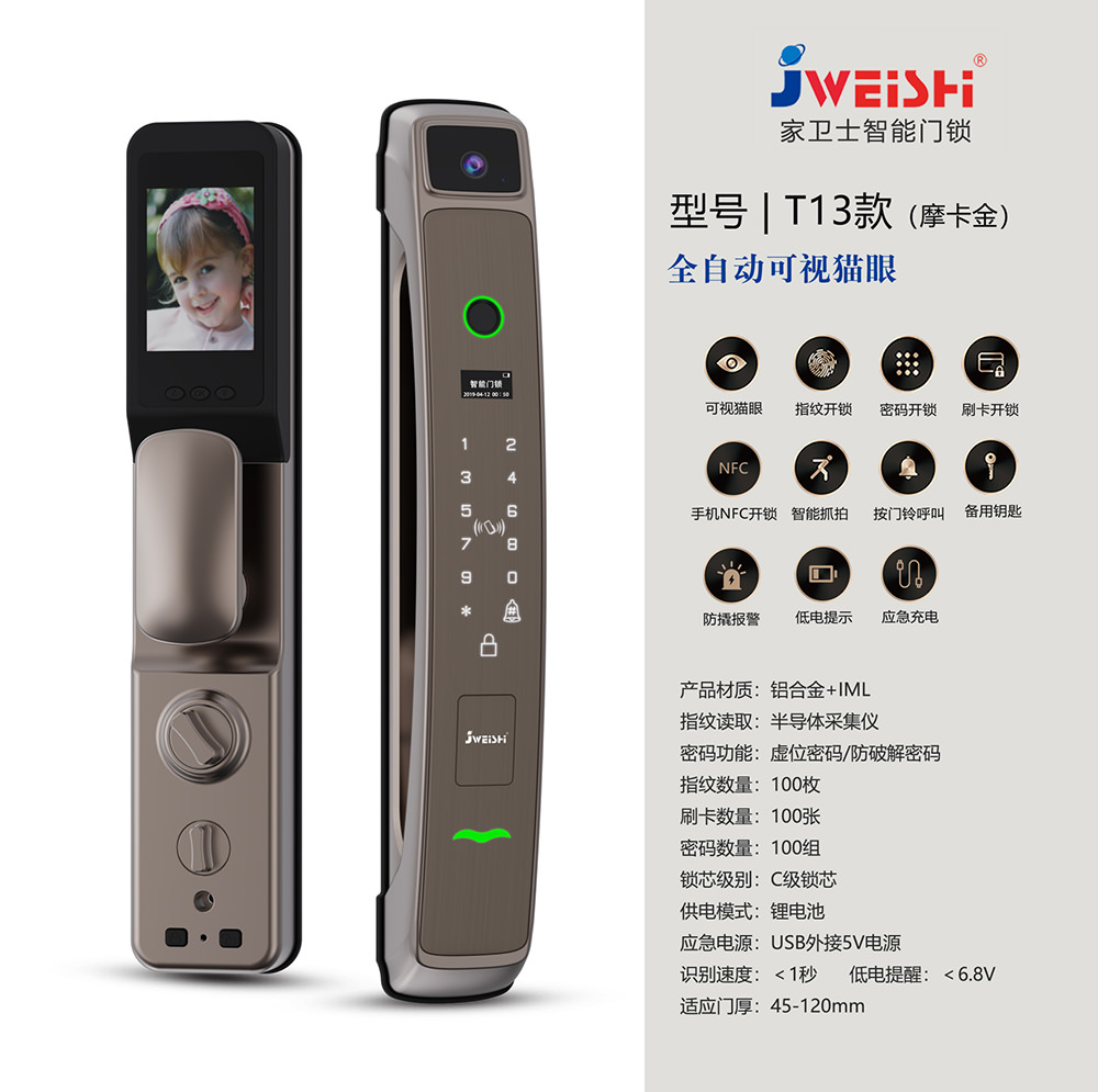 - 猫眼、防撬报警、虚位密码防窥视、延时自动上锁、逗留抓拍、主动监控、低电量报警、AI语音提示、支持多国语言