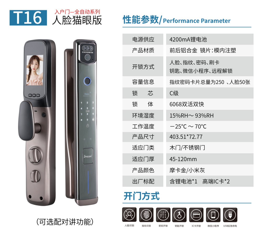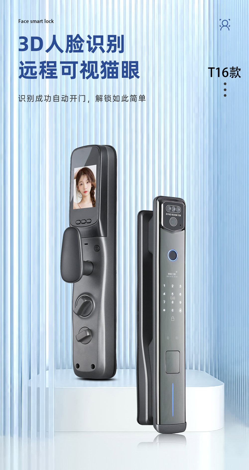 - 猫眼、防撬报警、虚位密码防窥视、延时自动上锁、逗留抓拍、主动监控、低电量报警、AI语音提示、支持多国语言