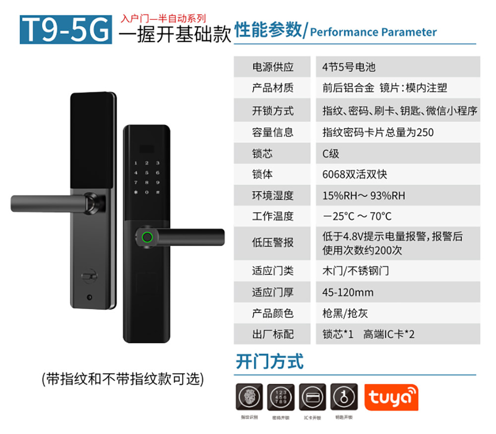 - 防撬报警、虚位密码防窥视、试错报警、低电量报警、AI语音提示、支持多国语言、应急充电