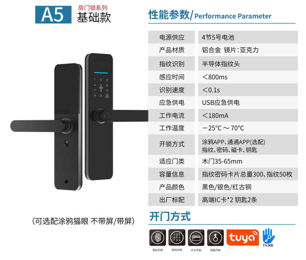 - 防撬报警、虚位密码防窥视、试错报警、低电量报警、AI语音提示、支持多国语言、应急充电、3.5寸高清显示屏 (选配)